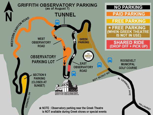 If there is no show at The Greek Theatre you may park for free in that parking lot and ride the DASH Observatory up the hill for .50. You will be dropped right at the front entrance of the building.
