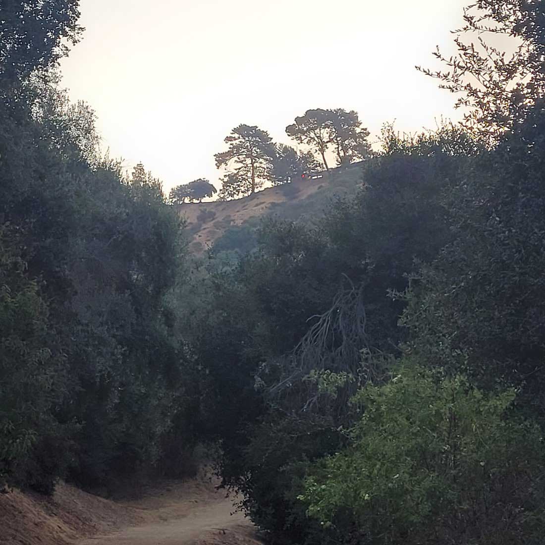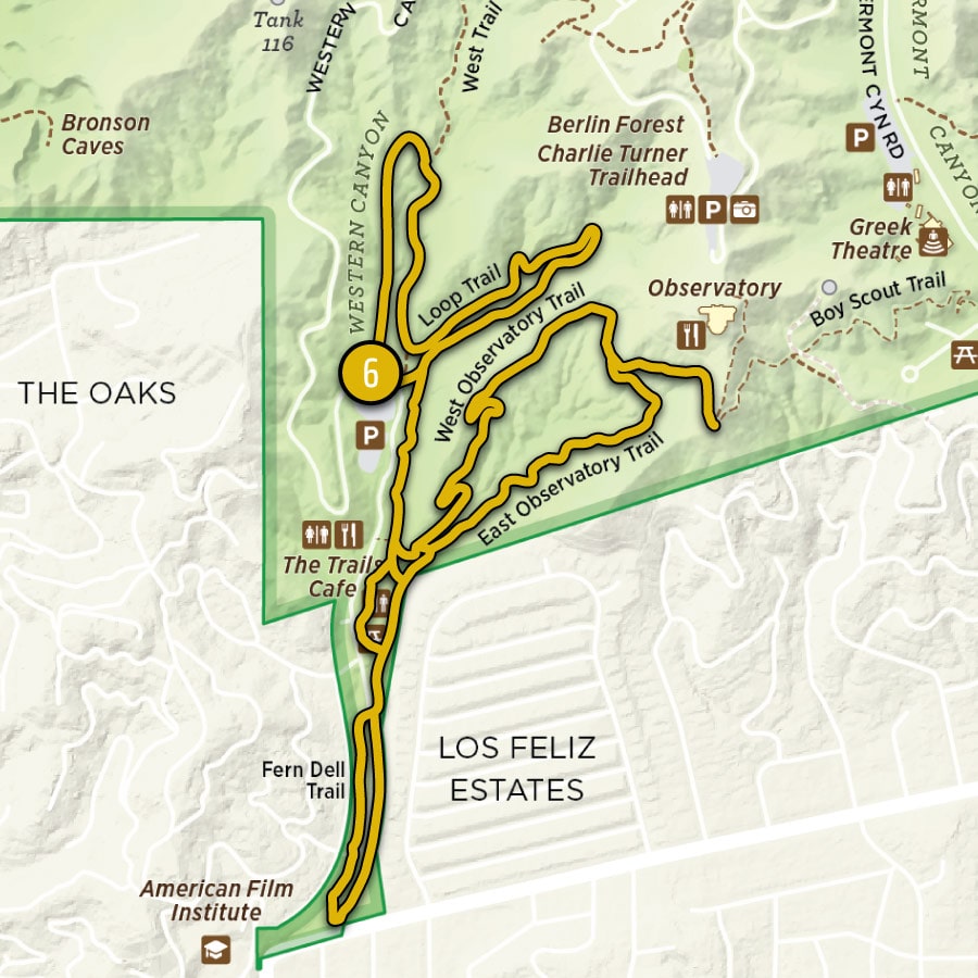 6.Continue straight to the West Observatory Trail (2.15). Turn around for a silhouette of the Berlin Forest and Captain’s Roost to the NE (2.2). Soon after, there’s a gorgeous, close-up view of the Hollywood Sign and curvy Western Canyon Dr. Photo op! (2.38) The trail slopes downhill and can be slippery (2.44); stay to the R side to take advantage of “steps” cut into the fire road. The trail curves L again (2.62), and you pass the junction with the bridge and East Observatory Trail to arrive back at the playground (2.74). Loop 3, complete.
