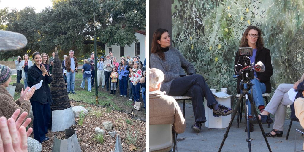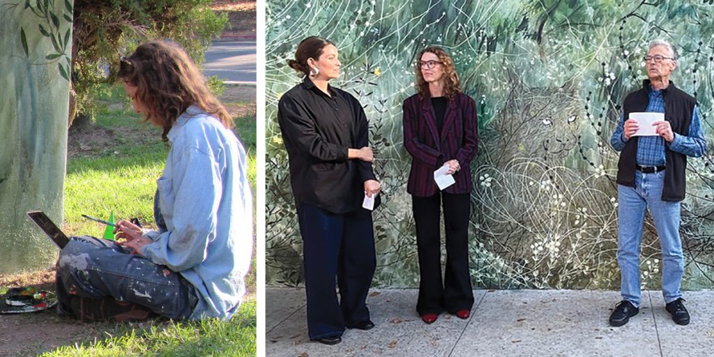In addition, a small native plant garden welcomed guests; a large plant spire was uncovered and the seeds inside will soon germinate. FoGP brought in native plant specialist Katherine Pakradouni to select and place plants that will augment yet not obscure the mural. This pollinator garden features a selection of sticky monkey flower, sage and blue-eyed grasses.