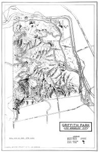 Mike Eberts’ book Griffith Park: A Centennial History opens with a 1935 map of the Park, created by the Works Progress Administration (WPA). Look closely — in the northeast quadrant is a small field that features a small biplane, hanger and runway referenced as the National Guard Airport.