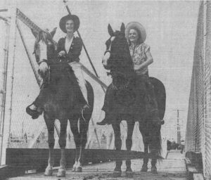 inset photo: Equestrian Bridge opens to Griffith Park Trails newspaper photo. Helen Griffith is on the right