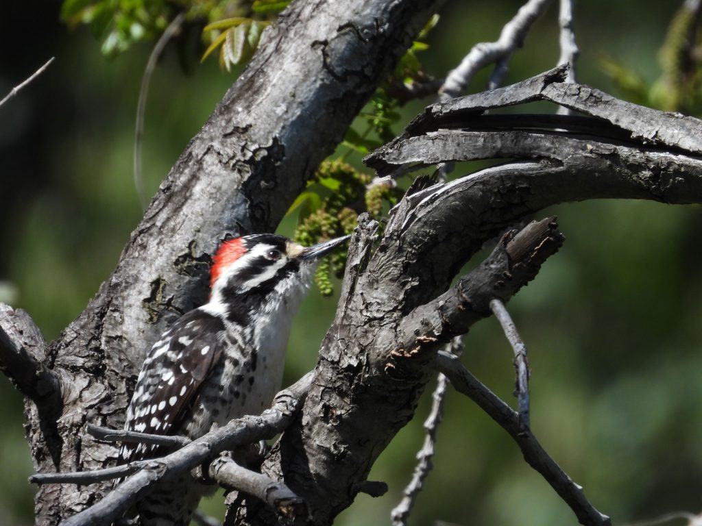 You’ll probably hear its distinct voice before you see the elusive Nuttall’s woodpecker. The call is a loud rattling with just a couple notes that most new birders find easy to learn. Other times you may first hear them drilling or “drumming” into bark or dead wood. The reason Nuttall’s do this varies. They could be looking for food as they poke under the bark of trees; however, they also could be marking their territory or punching out a cavity since they are cavity-nesters.